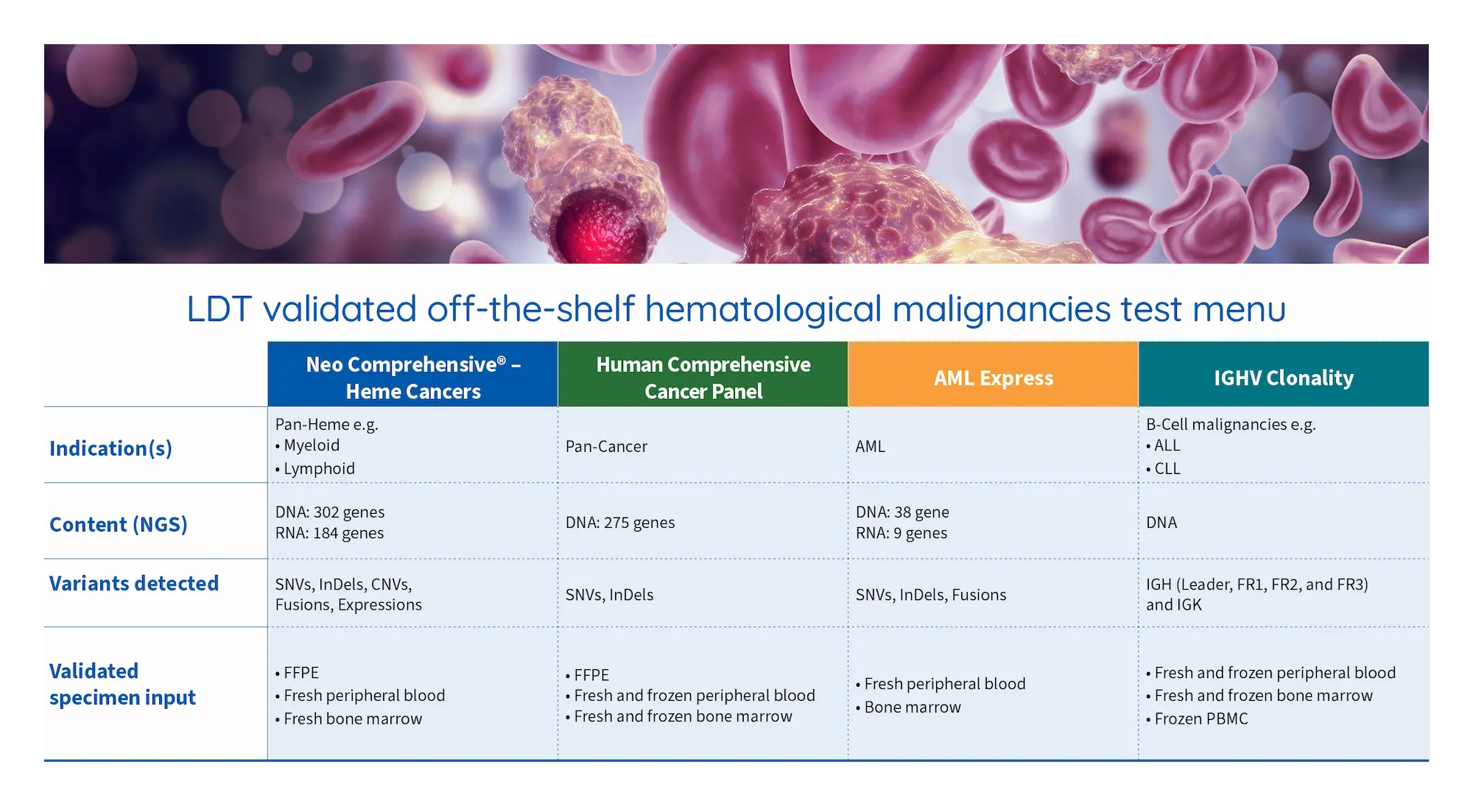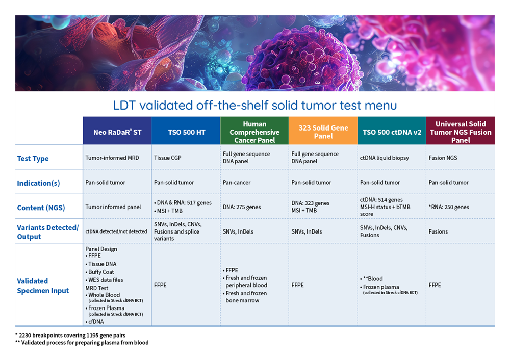 - Pre- and post-analytical processes including pathology review, nucleic acid extraction, QC, and data interpretation